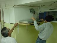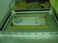 Aquí estamos ajustando el servidor sobre su soporte de aluminio para que todo esté prácticamente "estanco" y se aproveche mejor el frío que genera la nevera |