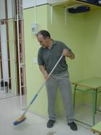 Y al final del todo hay que limpiar lo que manchamos (sobre todo las virutas de madera y aluminio de los cortes que hicimos para ajustar la nevera) ... suerte que Tomás -profesor del ciclo de Informática- se ofreció "voluntario" para realizar esta tarea. |