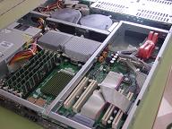Estas son "las tripas" del servidor que queremos refrigerar. En realidad, lo que más se calienta es el disipador color verde que se ve junto a los zócalos de memoria |